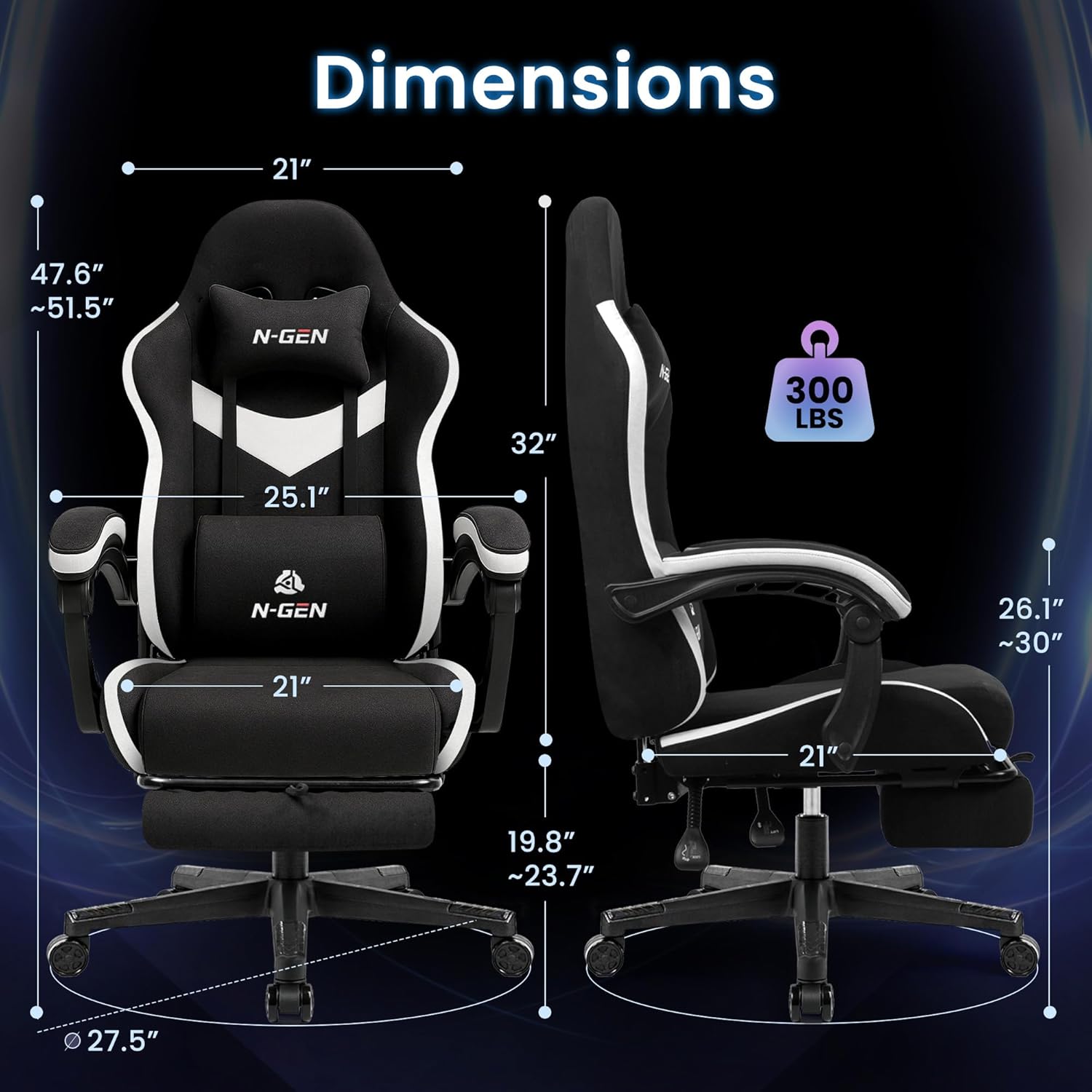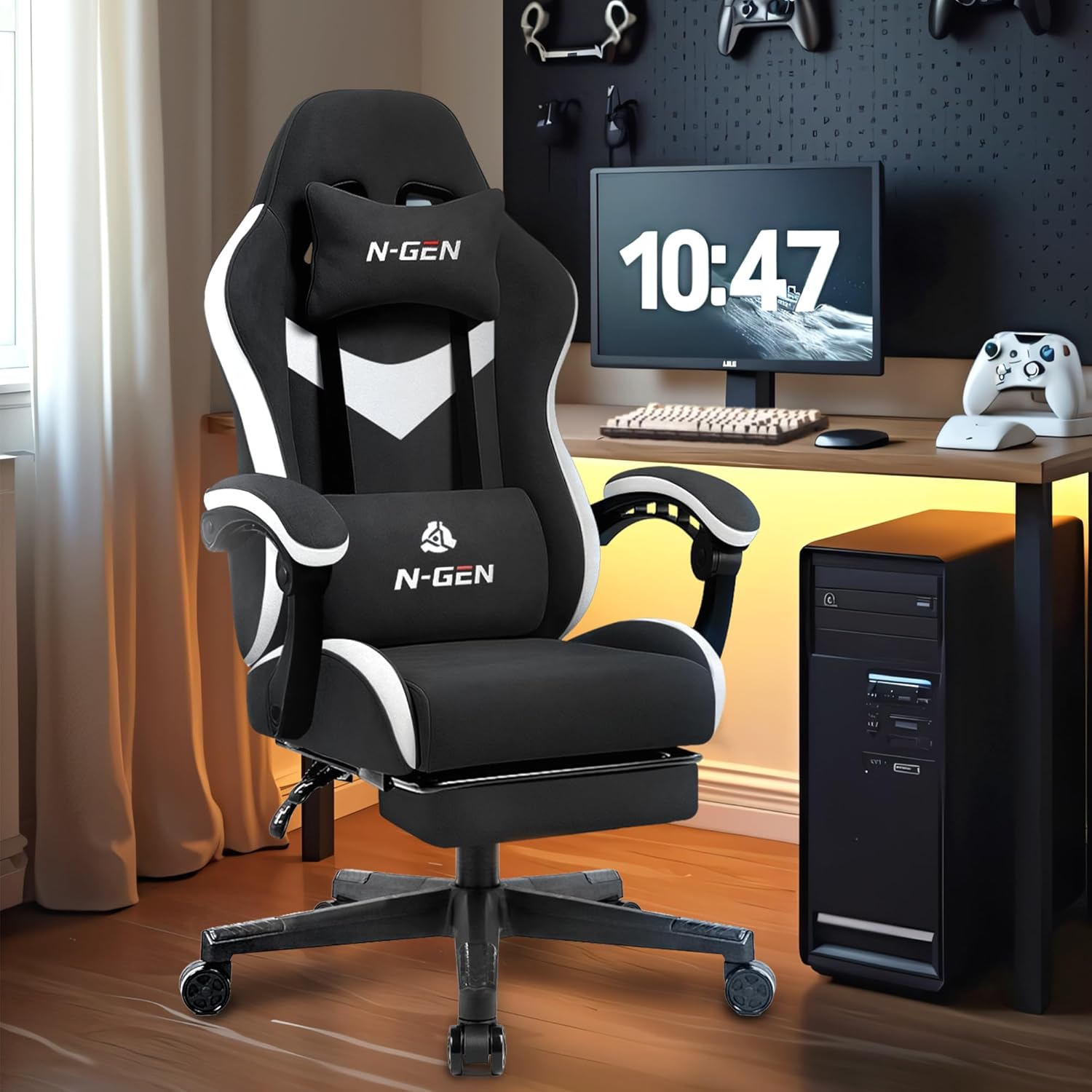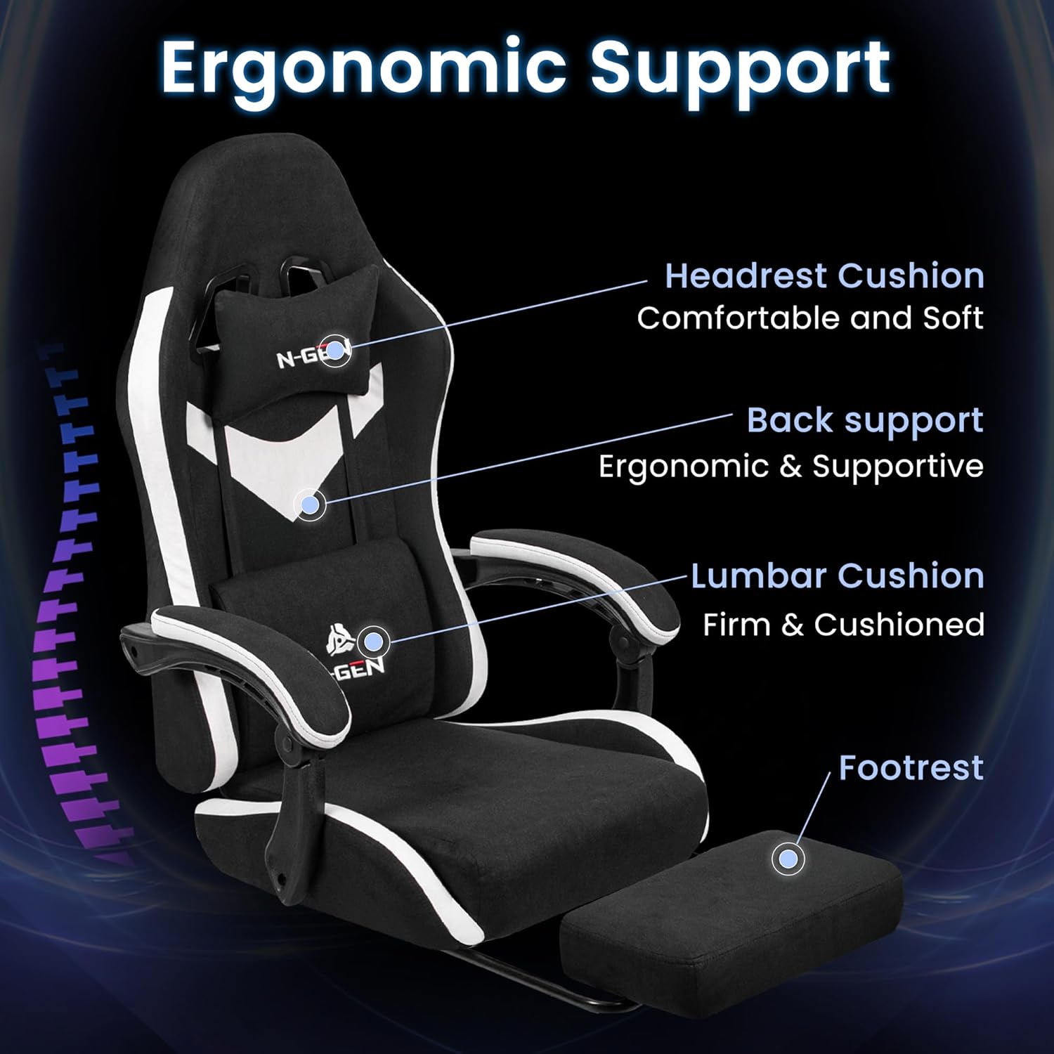 Experience superior comfort and support with the N-GEN GAMING Video Gaming Chair, designed for both home office and intense gaming sessions. Featuring an ergonomic design with plush lumbar support, high-density foam cushioning, and breathable fabric, this chair ensures you stay comfortable for hours. The adjustable armrests and reclining backrest let you customize your position, while the heavy-duty steel base supports up to 300lbs for lasting durability. Upgrade your workspace or gaming setup with this stylish, functional, and reliable chair from the N-GEN GAMING Store.